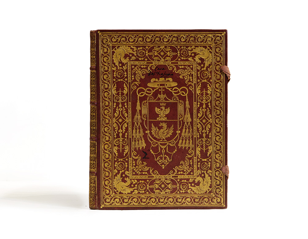 Legatura Borghese - Cafarelli Manoscritto su pergamena Manoscritto su pergamena redatto dal notaio vaticano Luca de Carolis per Scipione Borghese-Cafarelli, Roma 1612. In 4° (mm. 240 ×177). 24 carte vergate in inchiostro marrone, prima carta in oro ed inchiostro, all'ultima carta signum del notaio impresso in nero, sontuosa legatura coeva in marocchino eseguita da Soresini, ricca decorazione impressa in oro, piatti inquadrati da duplice cornice di filetti e rotelle, al centro del campo le armi del Cardinal Borghese-Cafarelli sormontate da cappello cardinalizio con cordoni e quattro ordini di fiocchi, al di sopra dello stemma l'iscrizione in inchiostro nero "Casa del Refugio", agli angoli interni delle cornici pezze araldiche, dorso a 4 nervi con i comparti completamente decorati, tagli dorati, fiocchi di seta, astuccio in marocchino nero. Sontuosa legatura eseguita dal legatore Soresini massimo esponente del barocco romano per il Cardinale Scipione Borghese-Cafarelli (1576 -1633). Il giovane Cafarelli assunse il nome e le armi dei Borghese nel 1605 quando fu creato cardinale da suo zio, Papa Paolo V (Borghese). Il cardinale fu un grande patrono delle arti a Roma. Fu mecenate del Bernini, costruì Villa Borghese, Villa Pinciana e Villa Tuscolana.