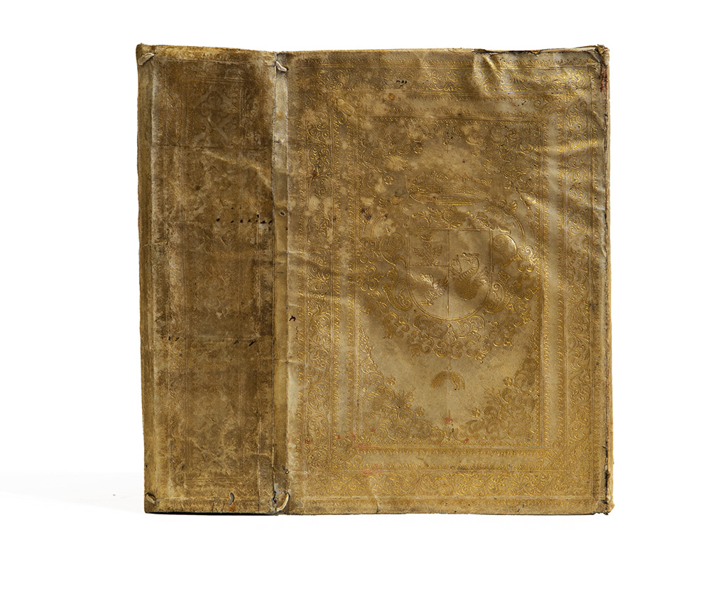Legatura Borghese - Garzoni, Tommaso La Piazza Universale di tutte le Professioni del Mondo Venezia, G.B.Somasco,1589. In 4°. Marca tipografica al frontespizio, capilettera e testatine decorate xilografiche, frontespizio sciupato, aloni di umidità, elegante legatura eseguita dalla bottega Andreoli del sec. XVII in pergamena con decorazione impressa in oro, ai piatti triplice cornice di filetti e rotelle, al centro del piatto le armi di Giovanni Battista Borghese ed Eleonora Boncompagni sormontate da corona, al dorso liscio fregi in oro, al taglio inferiore titolo ed autore manoscritti, difetti. Legatura in pergamena alle armi Giovanni Battista Borghese (1639 -1701) ed Eleonora Boncompagni eseguita dall'atelier Andreoli.