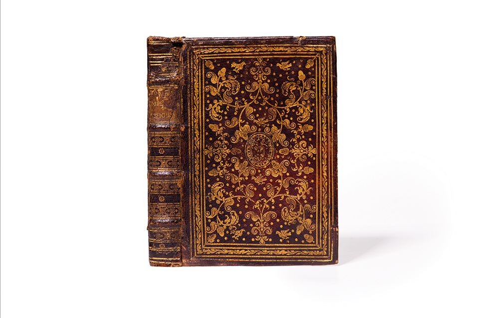 Legatura - Cavalieri, Giovanni Battista Romanorum imperatorum effigies. Elogijs ex diversis scriptoribus per Thomam Treterum S. Mariae Transtyberim canonicum collectis, illustratae Roma, [Francesco Coattino], 1590. In 8°. Elegante frontespizio architettonico figurato, grande stemma nobiliare dell'autore al recto di carta A1, 157 ritratti a piena pagina, marca tipografica al verso dell’ultima carta, macchie di umidità, strappo a p.151, ultime 3 carte con restauri e sciupate, legatura originale in marocchino rosso con decorazione impressa in oro, piatti inquadrati da 4 filetti e rotella, campo completamente decorato con ferri di fogliame, ghiande ed uccelli, al centro stemma nobiliare circondato da iscrizione (non identificati), dorso a 4 nervi, tagli dorati e cesellati, uno dei quali con titolo dipinto in rosso, piccole mancanze al dorso, decorazione sciupata. Nota di possesso manoscritta. Bella edizione, in elegante legatura cinquecentesca, di questa raccolta di ritratti di imperatori romani concepita ed incisa dall'artista trentino Cavalieri. Brunet I, 1697; Adams C,1182.