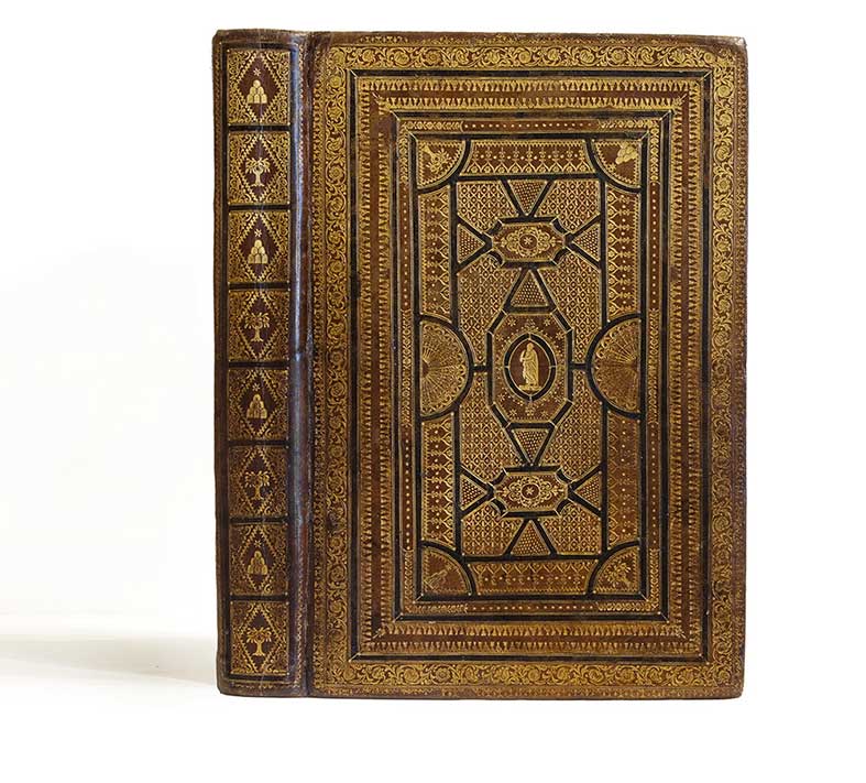 Legatura - Chigi Missale Romanum ex Decreto sacrosancti Concilii Tridentini restitutum Venezia, Guerilios, 1665. In 2°. Antiporta figurata incisa in rame a piena pagina, frontespizio con titoli in rosso e nero e grande vignetta, bei capilettera decorati, 3 tavole su rame fuori testo, testo inquadrato da cornice di duplice filetto e stampato in caratteri rosso e nero, legatura romana coeva in marocchino marrone completamente decorata in oro con le pezze araldiche della famigli Chigi, ai piatti molteplici cornici a rotella con motivi floreali sui piatti, due cornici a smalto nero che limitano un campo centrale diviso in compartimenti da un nastro smaltato di nero, agli angoli si alternano la rovere sradicata e i monti con la stella dei Chigi, ferrin a ventaglio sui lati lunghi, ai comparti seminati di motivi stilizzati, al centro un ovale con una figura di uomo togato e la piccola iscrizione "S. Barus" (Sanctus Bartolomeus), dorso liscio diviso da nastro smaltato di nero in otto compartimenti nei quali si alternano la rovere e i monti chigiani, tagli dorati, lievi restauri e lievi mancanze. Eccezionale legatura da amatore, eseguita nel 1665 -1670 dal cosiddetto "Enigmatic binder", per un membro della famiglia dei Principi Chigi.Questa legatura è stata esposta e riprodotta nel catalogo della mostra Legatura Romana Barocca 1565 - 1700, Roma, Edizioni Carte Segrete, 1991, avvenuta a Roma nel 1991. Legatura n. 70.Perfetto stato conservativo del volume e della legatura.cfr. Legatura romana barocca 1565 - 1700, n° 70.