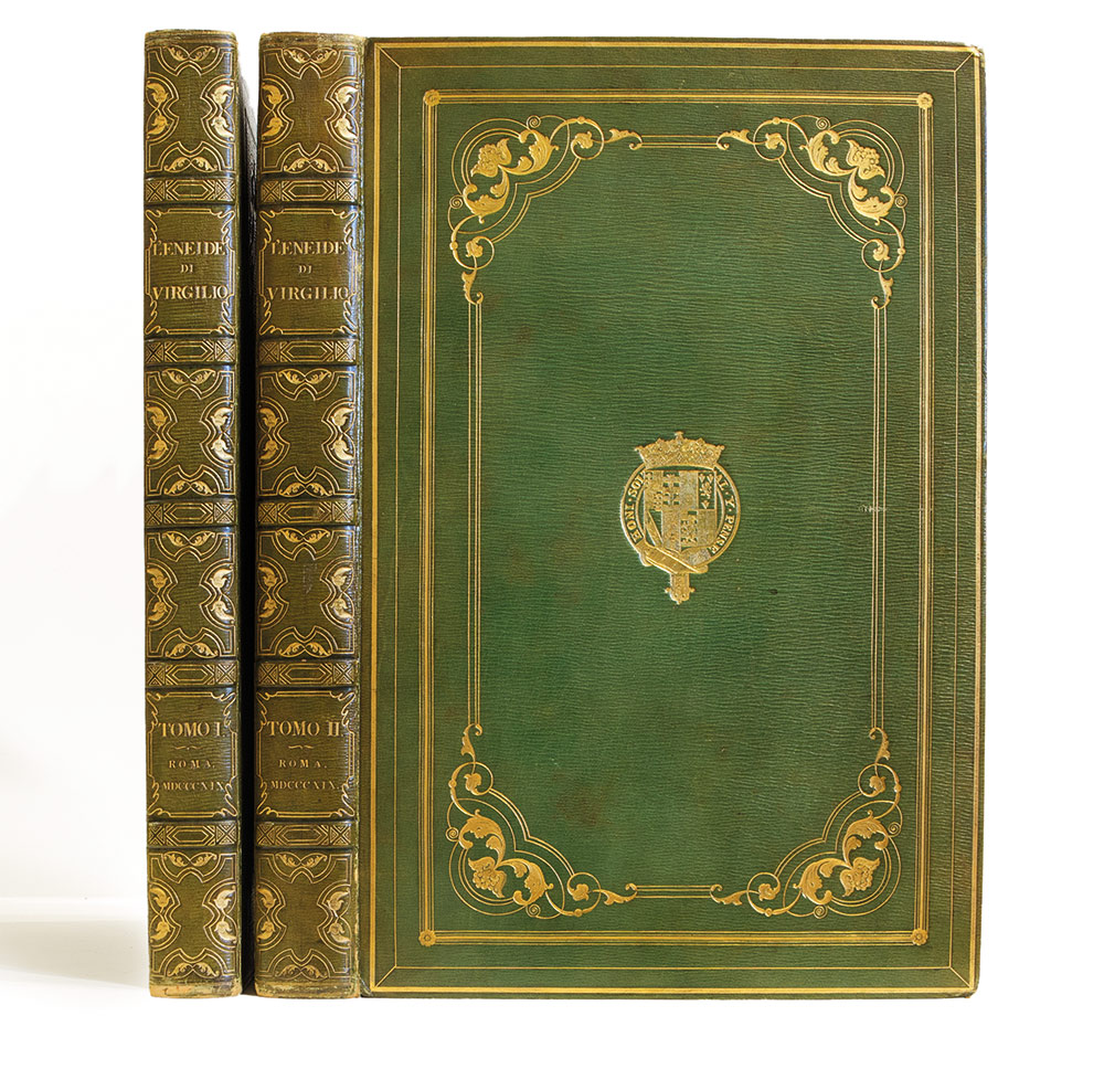 Legatura - Virgilio, Publio Marone L'Eneide di Virgilio recata in versi italiani da Annibal Caro Roma, Stamperia De Romanis, 1819. In 2°. 2 voll. Con due ritratti, 49 tavole finemente incise in rame, ciascuna protetta da velina, legatura inglese in marocchino verde a grana lunga, decorazione impressa in oro, piatti inquadrati da cornici di filetti e fregi fitomorfi, al centro del campo le armi del Duca di Sutherland sormontati da corona, doublure in marocchino verde e decori in oro, sguardie in seta beige, dorso a 5 nervi con titolo e fregi, tagli dorati. Ex libris “Earl of Goewer” al contropiatto. Sontuosa edizione rara in legatura di Hering appartenuta al Duca di Sutherland. L’iniziativa editoriale fu della dama inglese Elisabeth Hervey, duchessa del Devonshire che si assunse anche l’onere delle spese. Ne vennero tirate un limitatissimo numero di esemplari, 164 secondo l’Artaud e 230 secondo il Gamba. Il nostro esemplare è arricchito anche 2 rarissimi opuscoli: l’estratto del Giornale Arcadici di Roma del 1819 stampato espressamente per dare l’annuncio di questa edizione (6 carte), e l’ Elenco delle incisioni a stampa (2 carte). Quest’ultimo elenco, impresso mentre era ancora in corso la stampa dell’opera, non si riscontra nei repertori bibliografici. Gamba 1743: “Si è questo uno de’ più nobili libri che la moderna arte tipografica e calcografica abbia prodotti, e merita d’essere registrato anche per emendata lezione”. Brunet V, 1308: “Edition de luxe”.