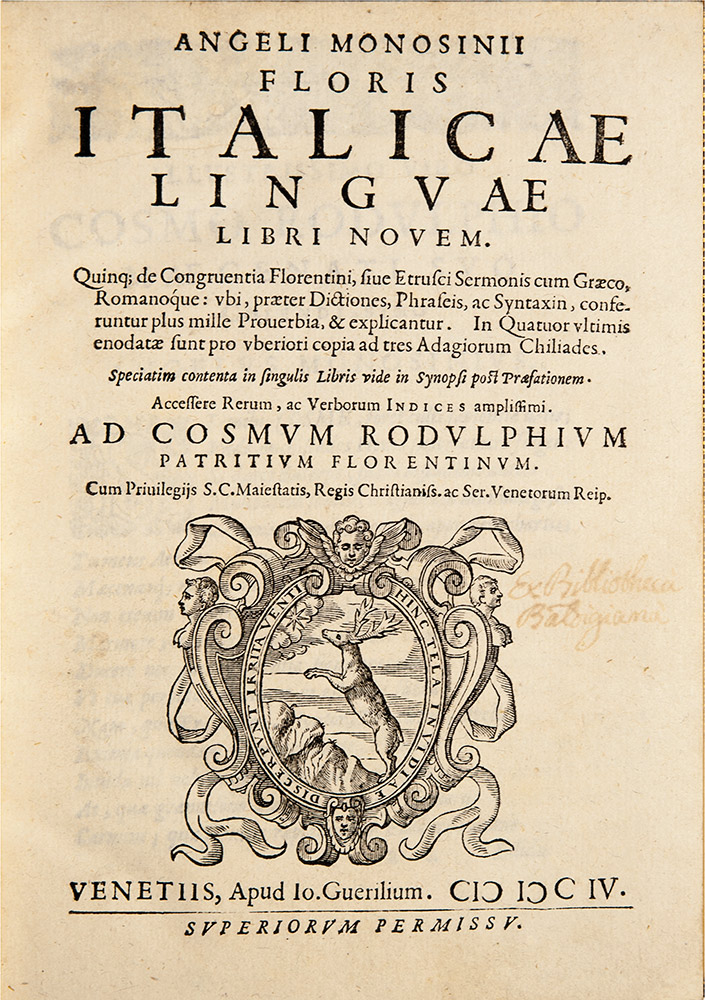 Lingua italiana - Monosini, Angelo Floris italicae linguae libri novem Venezia, Giovanni Guerigli, 1604. In 4°. Marca tipografica al frontespizio, testate e capilettera incisi, legatura in vitello del sec.XIX, con cornice di triplici filetti ai piatti, dorso a 6 comparti decorati in oro, titoli su tasselli verdi, tagli in oro. Ex libris nobiliare al contropiatto; nota di possesso manoscritta al frontespizio evanescente. Prima edizione, rara.Ecclesiastico ed erudito fiorentino (sec. XVI-XVII), oriundo di Pratovecchio, accademico della Crusca. Pubblicò Floris Italicae linguae libri novem (1604), in cui raccolse varie migliaia di proverbî e modi di dire italiani, confrontati coi corrispondenti greci e latini.