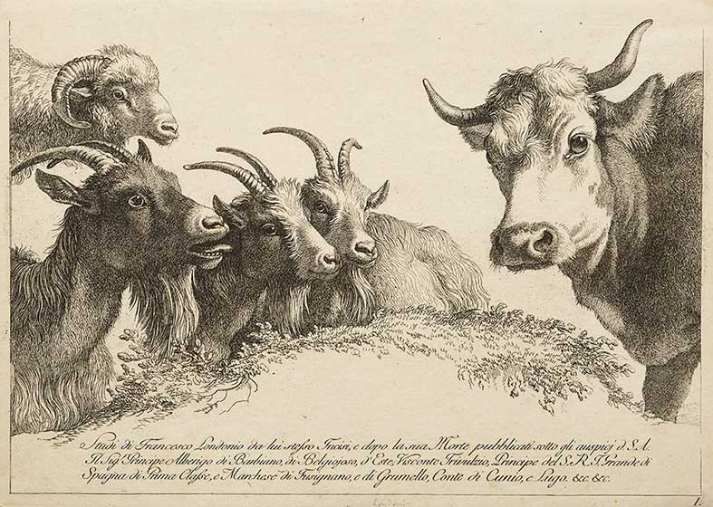 Londonio, Francesco Studi di teste di animali Quattro (di 6) fogli incisi all’acquaforte, post 1783 - ca. 1799, numerati, ciascuno c.ca mm. 178 x 245. Nel lotto anche un’acquatinta su disegno di Claude Lorraine incisa da Ludovico Caracciolo ed un foglio da un disegno di Berghen, inciso da F. Pedro e N. Cavalli. I fogli di Londonio fanno parte di una serie composta da sei acqueforti pubblicate dopo la morte dell'artista dal principe Alberico da Barbiano. Le Blanc 9-14.