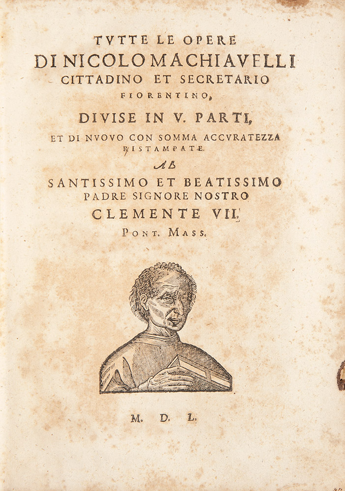 Machiavelli, Niccolò Tutte le Opere di Nicolo Machiavelli cittadino et secretario Fiorentino, divise in V parti et di nuovo con somma accuratezza ristampate S.l., s.e., 1550 [ma 1650]. In 4°. 5 parti in un volume, ciascuna con suo frontespizio. Ritratto dell’autore ai frontespizi, una tavola incisa a doppia pagina, esemplare brunito, macchia di inchiostro al margine esterno di circa 100 carte, legatura del sec. XVIII in pergamena, titoli manoiscritti al dorso. Ex libris manoscritto al risguardo. Una delle 5 edizioni cosiddette “della Testina” che compaiono sotto la falsa data del 1550, ma pienamente secentesca. Il presente esemplare (con paginazione 8, 320; [16], 280; 152; 158, [2]; [4], 106, [2] pp.) è conforme Bertelli-Innocenti, scheda 207, ed alla tera variante descritta da Gamba, n. 621. Brunet III, 1274; Gamba