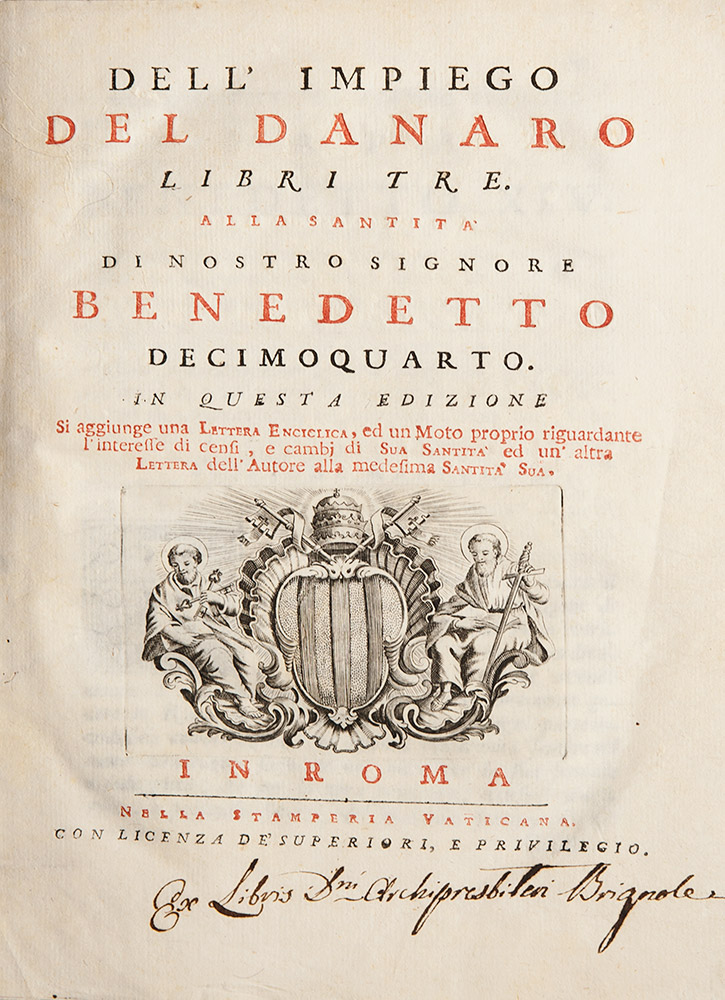 [Maffei, Scipione] Dell'impiego del danaro libri tre Roma, Stamperia Vaticana, s.d. [non prima del 1745]. In 4°. Frontespizio stampato in rosso e nero con vignetta incisa in rame con stemma di Papa Benedetto XIV, vignetta con vedutina, grandi capilettera figurati incisi in rame, qualche arrossatura sparsa, legatura originale in cartonato, mancanze al dorso. Nota di possesso manoscritto al frontespizio. Seconda edizione rara in cui sia il nome dell'autore che la data appaiono alle carte di dedica. L’opera venne pubblicata per la prima volta nel 1744 ed in essa l’autore, fautore di posizioni liberiste, difendeva la legittimità di un moderato interesse nel prestito del denaro e incoraggiava l'attività federatizia dei cristiani come strumento necessario ad uno sviluppo economico in senso moderno. Lo scritto fu condannato dalla Chiesa e l’edizione successiva fu autorizzata solo a patto che fosse premessa una lettera di accettazione della linea contenuta nell'Enciclica papale che assumeva una posizione di compromesso tra le tesi del Maffei e quelle del Concina.