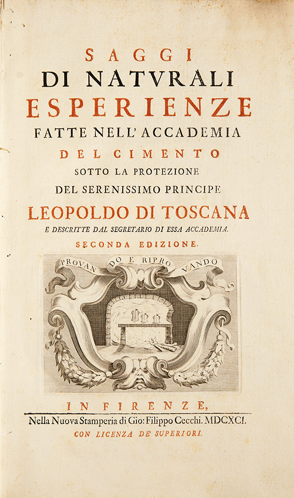 Magalotti, Lorenzo Saggi di naturali esperienze fatte nell'Accademia del Cimento Firenze, Gio. Filippo Cecchi, 1691. In 2°. Frontespizio in rosso e nero con stemma calcografico dell’Accademia del Cimento, 75 figure incise in rame a piena pagina raffiguranti gli strumenti scientifici utilizzati per gli esperimenti, testate, capilettera e finalini incisi, fori e gallerie di tarli nel margine interno di diverse carte con piccole lesioni al testo, marginali aloni di umidità, legatura coeva in pergamena rigida. Esemplare su carta grande, 355 x 240 mm. della seconda edizione.L'Accademia del Cimento fu la prima società scientifica organizzata. Fu fondata a Firenze nel 1657 con il patrocinio del principe Leopoldo e del Granduca Ferdinando II de' Medici. Tra i suoi membri figuravano Vincenzo Viviani, allievo di Galileo e di Torricelli, Giovanni Alfonso Borelli, Francesco Redi, Nicola Stenone e Lorenzo Magalotti. Lo stesso Magalotti compilò i Saggi, che descrivevano gli esperimenti condotti sulla pressione dell’aria, sugli effetti del vuoto, il congelamento dei liquidi, le proprietà del calore, la propagazione del suono e della luce, sulla calamita, sull'ambra e su altre sostanze considerate conduttori di elettricità. L’opera raccoglie inoltre gli studi sul perfezionamento dell'igrometro, del barometro a mercurio e del termometro.
