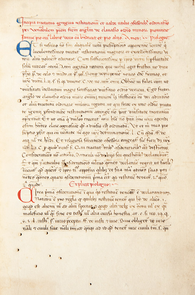 Manoscritto - Angelo da Chivasso Tractatus egregius restitutionum et valde utilis confessoribus ordinatue per venerabilem patrem fratrem Angelum de Clavasio ordinis minorum provinciae Ianuae pro ciuius laborem Deus eum benedicat et pro aliis Manoscritto cartaceo, metà sec. XV circa, 56 carte numerate nel margine superiore esterno, 215x150 mm., composto da 7 fascicoli di 8 carte, richiami alla fine di ciascun fascicolo, testo vergato in elegante semigotica di modulo piccolo in inchiostro bruno, titula in rosso, testo disposto su 29 righe below top line, rigatura ad inchiostro tenue, iniziali rubricate in rosso o blu, segni di paragrafatura, piccolo strappo a c.5, piccoli fori di tarlo, legatura del sec. XVI in pergamena floscia, dorso a 3 nervi, fori di tarlo ai piatti, piccola mancanza di pergamena al piatto anteriore. Lunga nota bibliografica ottocenteca applicata al contropiatto. Manoscritto gotico italiano, probabilmente della metà del ‘400, contenente il Tractatus de restitutionibus del francescano Angelo Carletti da Chivasso (Chivasso, circa 1411 – Cuneo, 11 aprile 1495), opera di carattere economico edita per la prima volta nel 1771 a Roma dal Giunchi. Si aggiunge, a c.64v, di altra mano, il testo della presunta lettera di Ponzio Pilato a Tiberio sulla morte di Cristo.