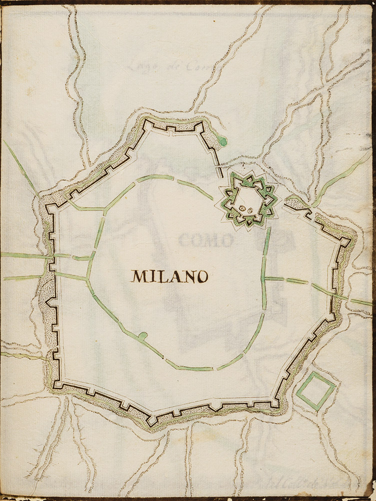 Manoscritto - Capece Della Somaglia, Teodoro Studio di Fortificazioni Manoscritto cartaceo acquarellato, 1726-1738, mm. 220x154, composto da 25 carte manoscritte in corsiva privata con numerosi disegni geometrici nel testo, e una pregevole vignetta in fine eseguita a china a mo’ di finalino calcografico, seguite da 52 carte con 26 disegni acquarellati di fortificazioni di città, molti firmati dall'autore, uno dei quali ripiegato, legatura coeva in mezza pelle con angoli, piatti in cartone decorato, titoli in oro al dorso. Ex libris nobiliare al contropiatto. Interessante manoscritto con 26 disegni acquarellati di fortificazioni di città, apparentemente inedito. Il testo, compilato dal nobile milanese Teodoro Capece Della Somaglia, "per suo studio particolare", nelle prime carte descrive, con moltissime annotazioni e figure, i modi per delineare le fortificazioni militari. Seguono 26 disegni acquarellati a piena pagina, raffiguranti fortificazioni di diverse città italiane, come Milano, Como, Messina, Casale di Monferrato, Tortona, nonché di città straniere, tra le quali Corbie, Boulogne, Stenay, Guise, Balvet ora Port Louis, Rue, Charleville, Sedan, Clermont, Chaumont, Nancy, S. Quentin, S. Malò, Villefranche. La nobile famiglia milanese Capece della Somaglia ottenne da Francesco Sforza l'impresa dei tre anelli incrociati e il titolo di conti e baroni. Spreti, Enciclopedia Storico-Nobiliare italiana, vol. 6, Milano 1932.