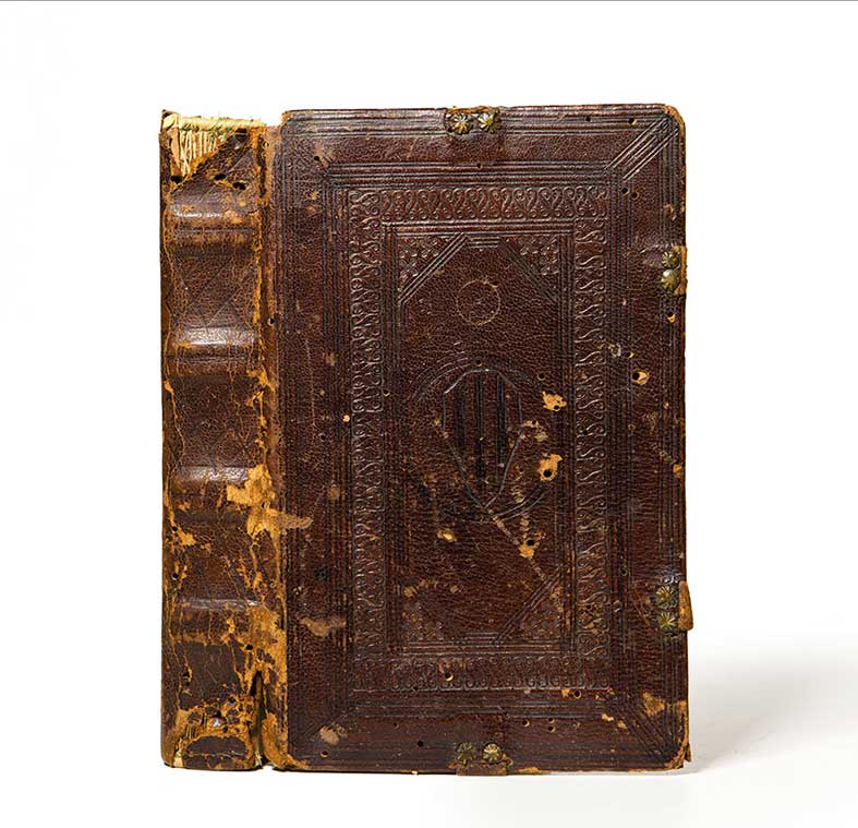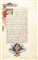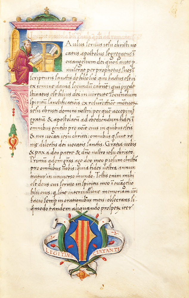 Manoscritto miniato - San Paolo Epistulae Manoscritto membranaceo, sec. XV ex. - XVI in., 148 carte non numerate, 188x120 mm., composto da 14 quinioni ed un quaderno finale, richiami alla fine di ciascun fascicolo, mancante almeno un fascicolo dopo carta 120, testo vergato in elegante umanistica corsiva di modulo piccolo in inchiostro bruno, titula in rosso, testo disposto su 22 righe below top line, rigatura ad inchiostro tenue, a carta 5r grande iniziale miniata “P” al principio dell’ Epistola ai Romani, raffigurante san Paolo seduto in uno scriptorium nell’atto di vergare un codice, al bas de page stemma non identificato a 3 bande verticali rosse su campo dorato, con motto “Legitime certanti”, piccole iniziali ornate eseguite in inchiostro dorato e su placchette quadrangolari colorate nei toni del rosso, verde e blu alle carte 122r, 128v, 134v, 138v, 145r, 145v, 146v, numerose iniziali rubricate in inchiostro rosso o blu, bella legatura coeva in pelle, ai piatti ricche cornici di filetti e di linee stilizzate impresse a secco, al centro scudo a tre bande impresso a secco, il medesimo che compare a c.5r, dorso a 4 nervi con decorazioni a secco ai comparti, tenoni metallici ai tre tagli, conservata la bindella al solo taglio inferiore, dorso scollato, qualche abrasione e foro di tarlo ai piatti. Ex libris manoscritto solo in parte leggibile al contropiatto, nota bibliografica ottocentesca applicata sul contropiatto, note di antica mano al verso dell’ultima carta. Manoscritto di lusso, vergato su fine pergamena di grande qualità, contenente il Corpus di Epistole di San Paolo e le sette Epistole Canoniche, con raffinata miniatura a principio del testo.