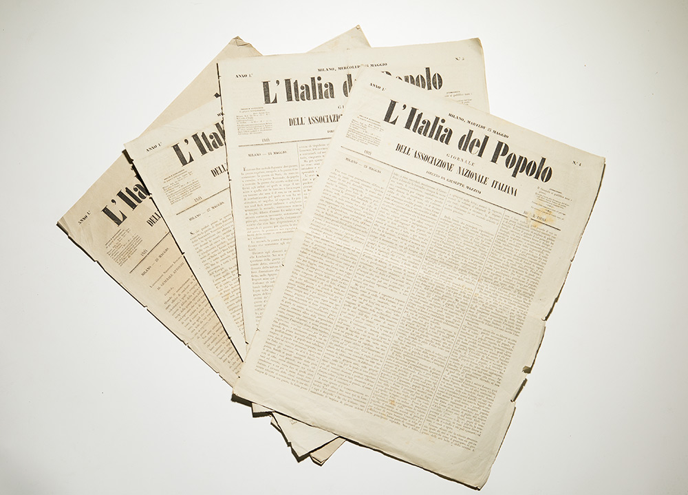 Mazzini, Giuseppe - Riviste L’Italia del Popolo. Giornale dell’Associazione Nazionale Italiana Milano, P.Agnelli, 1848. Anno I, numeri 4-5-8-9, del 23-24-27 e 28 maggio, foglio doppio di 480 x 360 mm., buone condizioni a parte marginali strappetti. Il 20 maggio 1848 Mazzini fondò il quotidiano L’Italia del popolo, coerente evocazione, sin dal titolo, del pensiero che lo guidava da anni: quello di una nazione che da Roma avrebbe diffuso «la parola della fratellanza universale e della concordia nell’opere», e lo avrebbe fatto con la repubblica, ossia con «la forma naturale della Democrazia» (Ed. nazionale…, XXXVIII, pp. 6, 10). Il giornale cessò le pubblicazioni in agosto, alla vigilia del ritorno degli Austriaci a Milano; e qui cominciarono le sue peregrinazioni, dalla Svizzera, dove era riparato al seguito della legione di Garibaldi, invocò la guerra di popolo (ma i fuochi di rivolta accesi in Val d’Intelvi si spensero subito), e quindi, dopo un breve soggiorno a Marsiglia, riprese la via dell’Italia.Il primo numero (che portava in epigrafe il motto “Unità, Dio e il popolo”) uscì il 20 maggio 1848 e l'ultimo il 3 agosto dello stesso anno. L'Italia del popolo fu un giornale di singolare importanza, poiché con esso Mazzini affrontò per la prima volta la stampa quotidiana. Il corpo redazionale era composto da quattro persone. “Estensore in capo” era Giuseppe Revere, che dal 7 giugno firmò il quotidiano quale “gerente responsabile”, succedendo a Mazzini. Sebbene il quotidiano ebbe vita breve (ne uscirono solo 74 numeri), riuscì ad introdurre nella stampa italiana il modello del giornale di grande formato di tipo francese, impaginato su quattro colonne, con articoli ed editoriali per lo più anonimi e altre innovazioni.