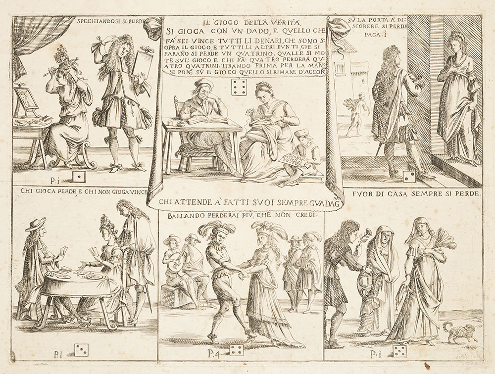 Mitelli, Giuseppe Maria Il Gioco della Verità Acquaforte tirata su carta forte, Bologna, 1688, nome dell’autore in basso a destra, piccole macchie e fioriture, mm. 300 x 400. Raro foglio. Il gioco è diviso in sei scomparti, ciascuno con una sentenza morale ed una scena che la illustra: una coppia si abbiglia allo specchio; marito e moglie assorti nei loro lavori di conto e di cucito mentre il bimbo legge attento il sillabario; il giovine parla alla sua bella che sta sulla soglia di casa; un cicisbeo assiste da spettatore al gioco di una coppia; una coppia in maschera balla al suono di una mandola; un damerino porge un fiore ad una giovane con la compiacenza dell'accompagnatrice. In ogni scomparto, un dado col punto corrispondente. Angelini, I 33 Giochi del Mitelli, 1976.