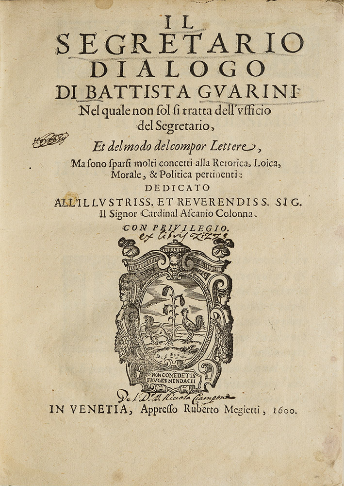 Diplomazia & politica - Guarini, Battista Il Segretario dialogo di Battista Guarini: nel quale non sol si tratta dell'vfficio del segretario, et del modo del compor lettere, ma sono sparsi molti concetti alla retorica, loica, morale, & politica pertinenti Venezia, appresso Ruberto Megietti, 1600. In 4°. Marca tipografica sul frontespizio, altra marca nella testata a c.A2 di Grazioso Percacino, legatura moderna in mezza pergamena e cartone marmorizzato. § Giacomo Marzari. La Prattica e Theorica del Cancelliere. Vicenza, Giorgio Greco, 1602. In 4°. Marca tipografica al frontespizio e in fine volume, aloni di umidità agli ultimi fascicoli, legatura coeva in pergamena floscia. § Benedetto Pucci. L’Idea di Varie Lettere. Venezia, Giunti e Ciotti, 1612. In 4°. Marca tipografica al frontespizio, marginali aloni e fioriture, legatura coeva in pergamena floscia, piatto superiore staccato. Insieme nel lotto altre due operette sul segretario di Isidoro Nardi, 1746 e 1820.