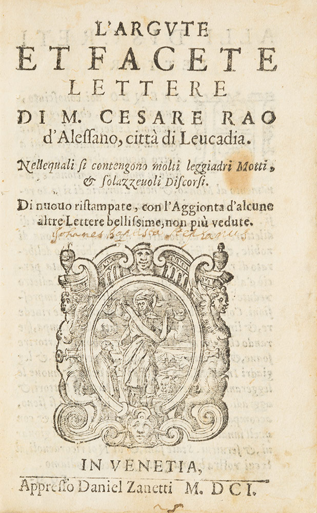 Epistole - Rao, Cesare L'argute, et facete lettere di m. Cesare Rao d'Alessano, città di Leucadia. Nelle quali si contengono molti leggiadri Motti, e & solazzeuoli Discorsi Venezia, appresso Daniel Zanetti, 1601. In 8°. Marca al frontespizio, bruniture e aloni, legatura del sec.XIX in mezza pelle e cartone. Ex libris in rima al verso dell’ultima carta e al frontespizio di Giovan Battista Stefani. § G.Francesco Peranda. Lettere. Venezia, Barezzo Barezzi, 1625. In 8°. Marca al frontespizio. Legato con La nuova idea di Lettere. Venezia, B.Barezzi, 1624. § Diomede Borghesi. La terza parte delle Lettere discorsive. Siena, Luca Bonetti, 1603. In 4°. Marca tipografica al frontespizio e in fine volume, capilettera abitati, senza legatura. Insieme nel lotto due edizioni di lettere del sec.XVII.