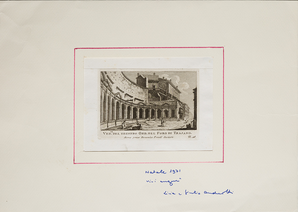 Andreotti, Giulio Stampa con dedica Incisione del sec.XVIII di Domenico Pronti del Foro di Trajano, 120 x 85 mm., applicata su passepartout con dedica in basso “Natale 1971 vivi auguri Livia e Giulio Andreotti”.
