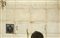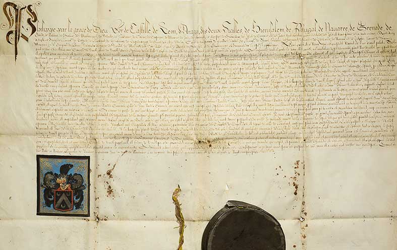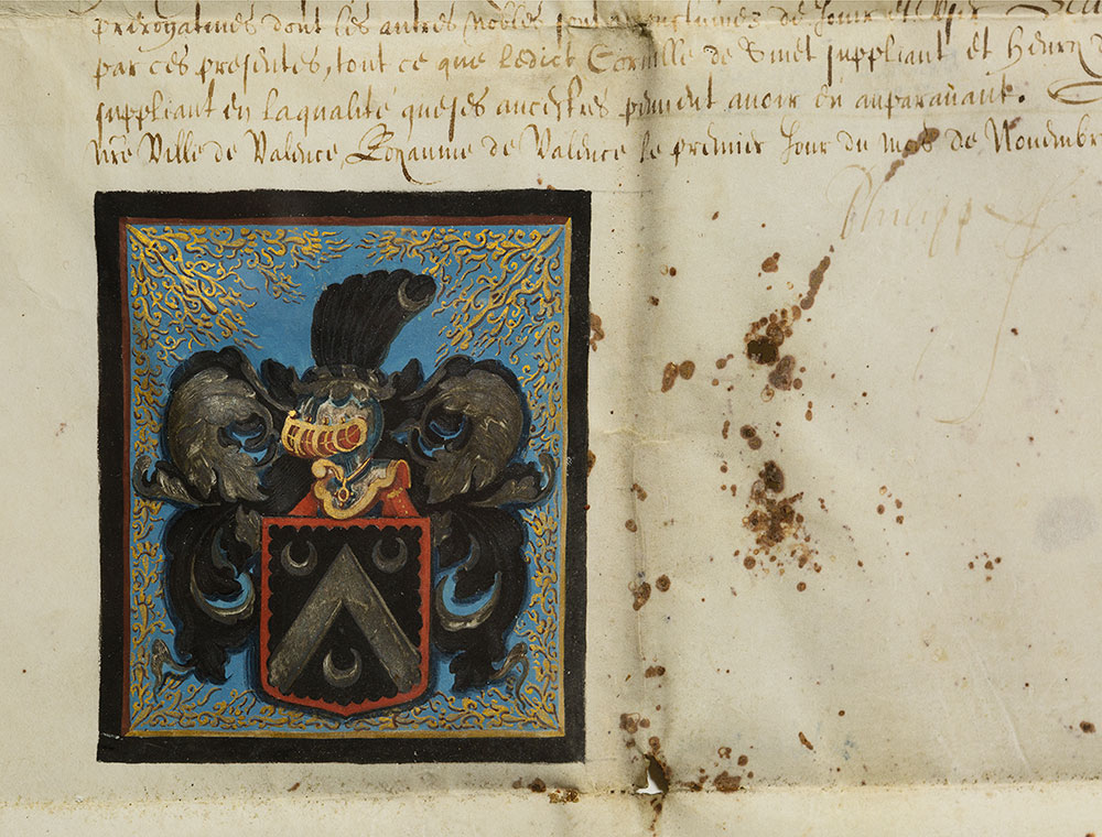 Filippo IV di Spagna - Philippe d'Anneux, Marquis de Wargny Patente nobiliare - Paesi bassi spagnoli Patente pergamenacea ripiegata più volte, 655 x 490 mm., grande stemma nobiliare - 105 x 90 mm. - in basso a sinistra acquarellato in oro, rosso, nero e celeste, firma del re in calce, al verso firme di cancelleria di Brecht, Colbrant e altri, datata Bruxelles 1 novembre 1645. “Patentes de rehabilitation de noblesse” di Filippo IV di Spagna (1605-1665), regnante sui Paesi Bassi dal 1621 al 1665, concessa a Philippe d'Anneux, Marquis de Wargny ou Wargnies, baron de Crèvecoeur, seigneur d'Abancourt, de Buath et de la principauté de Barbançon (Barbençon), premier pair, châtelain et vicomte de Cambrai, gouverneur d'Aire, de Courtrai et de Ath, général de bataille au service du roi d'Espagne. Lo stemma nobiliare a tre crescenti in oro su sfondo nero con cimiero, è di una delle più antiche famiglie nobili belghe, al servizio di Filippo IV.