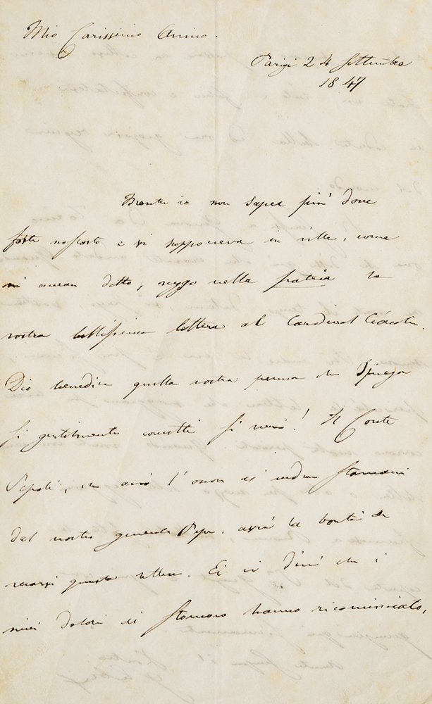 Libri, Guglielmo Lettera autografa firmata Due pagine in 8°, 205 x 182 mm., su bifolio, rapida grafia in corsivo, inchiostro nero. Interessante e istruttiva lettera dall'esilio di Parigi, firmata e datata Parigi 24 settembre 1847. Guglielmo Libri, eminente matematico, era all'apogeo della carriera: insignito della Legion d'onore, cattedratico presso il College de France. Ma era anche nel pieno della sua attività di trafficante di libri e l'anno seguente sarà formalmente denunciato. In questa lettera ragguaglia il suo corrispondente sul modo più sicuro per iniviargli "lettere o altro": utilizzando la copertura del Sig. Guizot "ogni cosa giungerà sicuramente". Nel 1847 Guillaume Guizot era presidente del Consiglio.