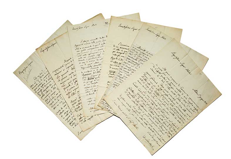 Lichtenthal, Pietro Lettere autografe firmate 8 pagine in 8° gr., 250 x 200 mm., su 6 bifogli. Lettere viaggiate, scrittura in corsivo, inchiostro bruno. Scrivendo un'opera Botanica assai complicata, prendo la libertà di rivolgermi a lei… avrei molto bisogno della Flora Veronensis del Pollini, stampato a Verona… Non bramo spendere denaro, ma fare il cambio con l'unica copia nuova che posseggo del mio Dizionario e Bibliografia della musica… a Vienna comunque non paghino così bene gli autori come nella Germania settentrionale, danno però buoni compensi agli scrittori di buone opere. Interessantissimo carteggio scientifico con curiose annotazioni personali. Si tratta di sei lettere autografe firmate del grande bibliografo e musicologo, tutte indirizzate all'Abate Carlo Racca di Novara, comprese tra il 1836 e il 1838. Riguardano notizie su volumi, bibliografie, ricerca di libri, invio di pubblicazioni, compensi agli scrittori, opere in corso. Si fanno numerosi riferimenti al Dizionario e bibliografia della musica, edito a Milano nel 1823, all'opera sul Duomo di Novara del Racca, inviata in omaggio a Lichtenthal, al lavoro di quest'ultimo sull'Acqua comune e minerale, in quel momento in procinto di essere pubblicato, con amplissima descrizione dei caratteri tipografici del volume. Si tratta in definitiva di un carteggio densissimo di notizie bibliografiche e di informazioni sul mercato editoriale italiano di primo ottocento.