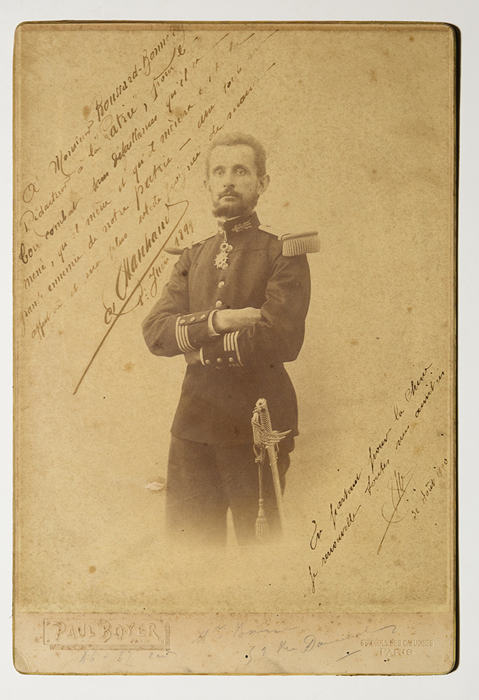 Marchand, Jean Baptiste Foto con dedica Foto di grandi dimensioni, 305 x 205 mm. con lunga dedica autografa a Boussard Bonnefoy, datata 1 giugno 1899, timbrata a secco Paul Boyer Parigi. Jean-Baptiste Marchand (2 novembre 1863 – 13 gennaio 1934) è stato un ufficiale francese ed un’esploratore in Africa. Partecipò alla conquista del Senegal, esplorò le fonti del Niger e del Nilo, ed è ricordato per la resistenza a Fashoda contro gli anglo-egiziani. La dedica è al celebre gironalista e politico francese Boussard, fondatore di diverse testate, attivista, movimentista ma anche letterato e poeta.