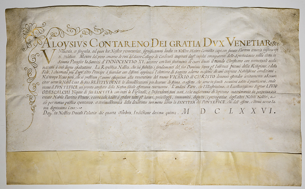 Odescalchi, Livio - Alvise Contarini Patente di Nobiltà veneta Pergamena di 640 x 450 mm., vergata in inchiostro nero e dorato con festone fitomorfo laterale, sottoscritto in basso dal segretario Agostino Bianchi, datata Palazzo Ducale [Venezia], 1676, sotto il dogato di Alvise Contarini. Concessione perpetua di patente nobiliare a Livio Odescalchi e famiglia: “Livio Odescalchi Nipote di Sua Santità con tutti li Figliuoli, e Discendenti suoi nati, e che nasceranno di legitimo matrimonio in perpetuo sia creato Nobile Patritio Veneto, e come tale habbi à godere tutti gl’honori, privileggi, immunità, dignità, e prerogative degl’altri Nobili Nostri”. Alvise Contarini (Venezia, 24 ottobre 1601 – Venezia, 15 gennaio 1684) fu il centosesto doge della Repubblica di Venezia, in carica dal 26 agosto 1676 alla morte. Il suo dogato fu pacifico e mirò soprattutto a sanare il pesante passivo economico accumulato in seguito alle guerre contro i turchi. Pochi giorni prima della sua morte, Venezia riaprì le ostilità con l'impero ottomano.Livio Odescalchi (Como 1658 - Roma 1713) fu il nipote di papa Innocenzo XI , uno dei più illustri mecenati e collezionisti della Roma seicentesca. Costituì il caso esemplare di un aristocratico non solo amante dell’arte, ma dilettante e con buone conoscenze tecniche sia nel disegno sia nella pittura.