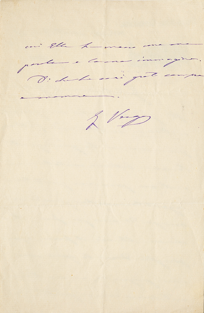 Verga, Giovanni Lettera autografa e firmata Due pagine in 8°, 210 x135 mm.,...