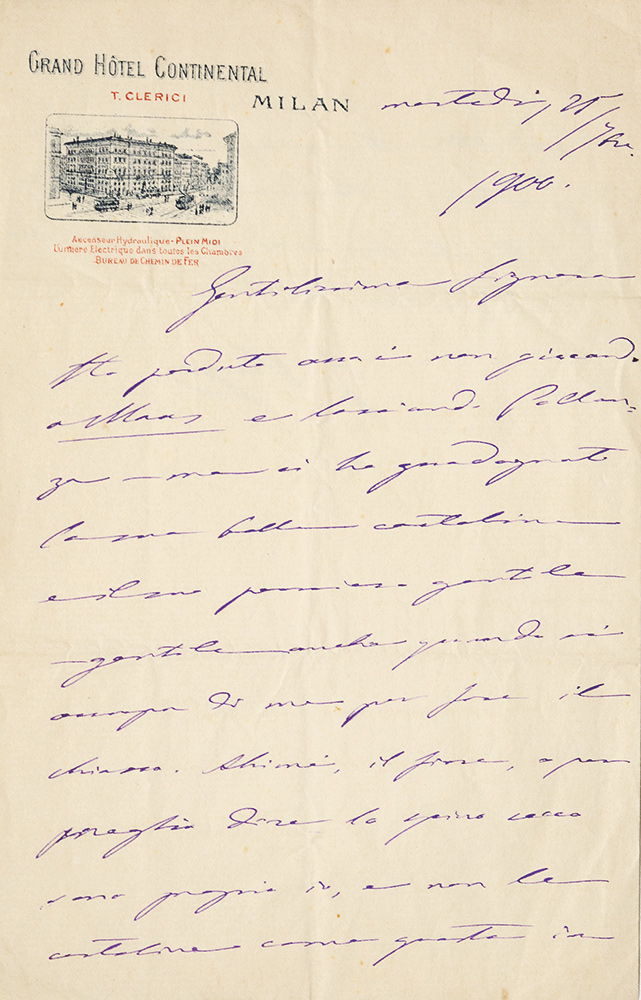 Verga, Giovanni Lettera autografa e firmata Due pagine in 8°, 210 x135 mm., su bifolio, lettera autografa firmata datata Milano martedì 25 settembre 1900 e indirizzata ad una gentilissima signora. Ho perduto amici non giocando a Mars e lasciando Pallanza - ma ci ho guadagnato la sua bella cartolina e il suo pensiero gentile… Ahimè il fiore, o per meglio dire, la spino secco sono proprio io, e non le cartoline come questa.Curiosa e interessante lettera indirizzata a una "Gentilissima Signora". La lettera è scritta su carta intestata "Grand Hotel Continental Milano".