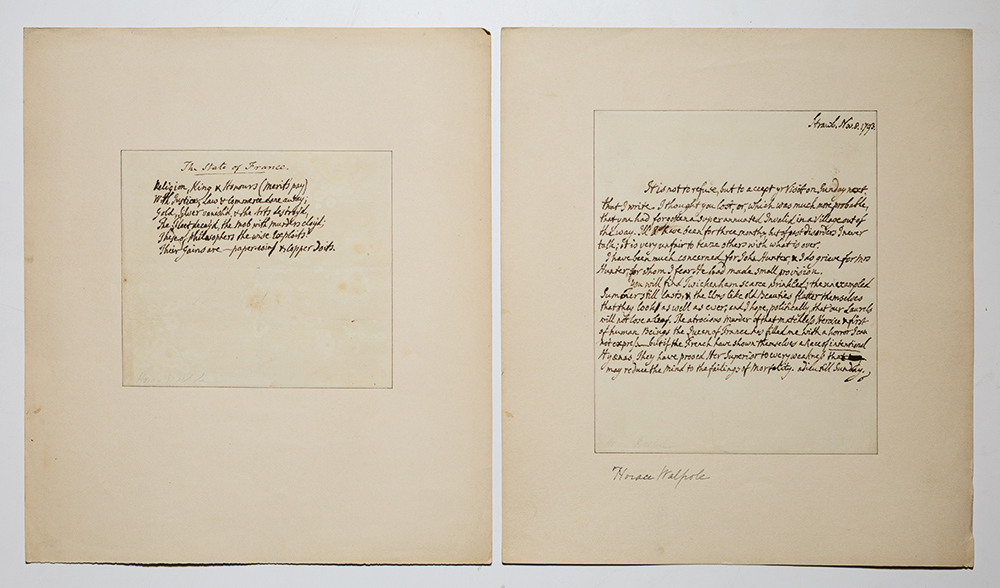 Walpole, Horace Lettera autografa e versi Lettera autografa in 4°, una pagina, 195 x 163 mm., datata Strand 8 novembre 1793, montata su passepartout; insieme sei versi di un componimento intitolato The State of France, un foglio di 136 x 146 mm. montato su passepartout. “It is not to refuse, but to accept your visit on Sunday next, that I write. I thought you lost, or, which was much more probable, that you had forgotten a superannuated Invalid in a Village out of the way. (...) I have been much concerned for John Hunter [illustre medico scozzese, noto per essere stato fautore della necessità di fondare la chirurgia sulla ricerca e sulla sperimentazione]...You will find Twickenham scarce wrinkled: the unexampled Summer still lasts, & the Elms like old Beauties flatter themselves that they look as well as ever; and I hope politically, that our Laurels will not lose a leaf. The atrocious murder of that matchless Heroise et first of human Beings the Queen of France has filled me with a horror I can not express [si riferisce alla morte di Maria Antonietta, ghigliottinata il 16 ottobre 1793]. But if the French have shown themselves a race of intentionalHyaenas they have proved Her superior to every weakness that may reduce the Mind to the failings of Morality. Adieu till Sunday.” I versi del foglio acclusi, dal titolo The State of France, sono una sestina a rime baciate ed ironizzano sullo stato della Francia di fine secolo.