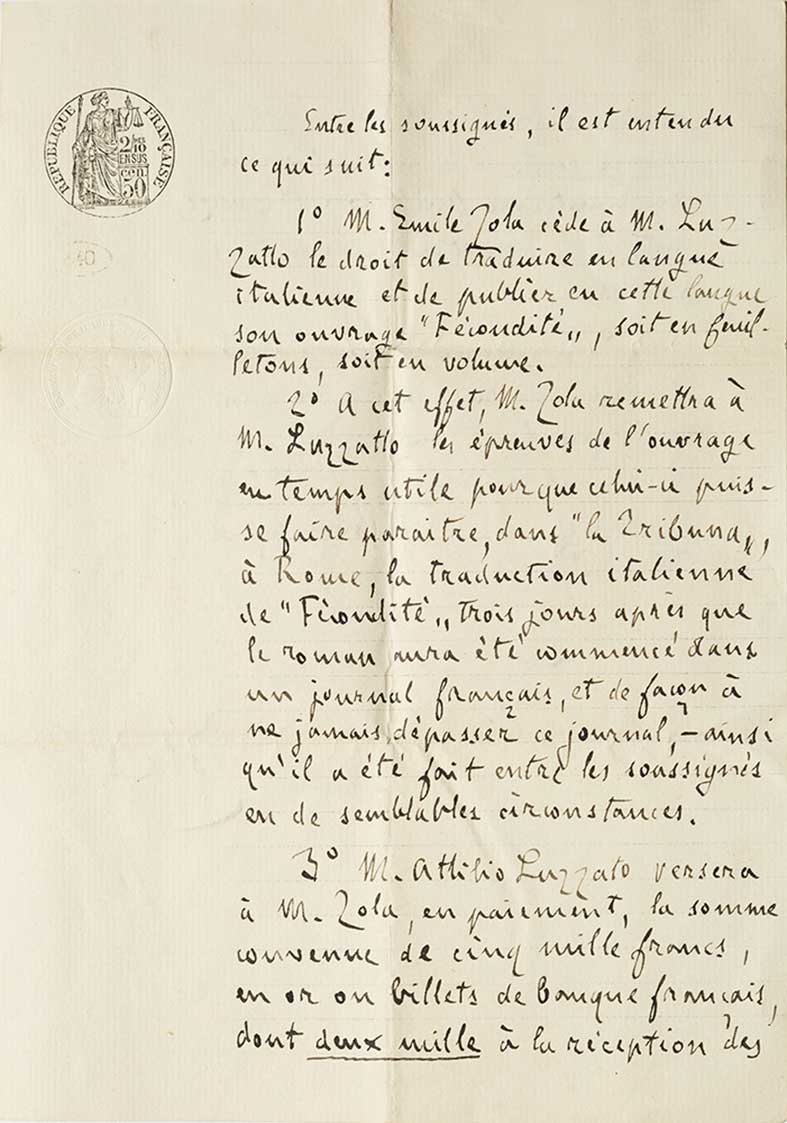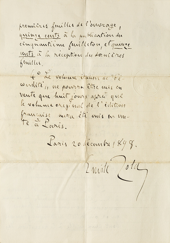 Zola, Émile Contratto editoriale autografo Due pagine in 4°, 250 x 175 mm., firmato in calce da Zola in data Parigi, 20 dicembre 1898, indirizzato ad Attilio Luzzatto. Interessante contratto editioriale tra Zola e Attilio Luzzatto, il celebre direttore della rivista La Tribuna (1883-1946). Nel 1887 la proprietà fu rilevata dal principe Maffeo Sciarra Colonna, che dotò il giornale di una propria tipografia e di una propria sede (Palazzo Sciarra) e tramutò La Tribuna in un foglio di sole notizie, non politicamente connotato. La nuova proprietà promosse alla direzione Attilio Luzzatto. Nel 1890 uscì il supplemento settimanale La Tribuna illustrata. Nel 1895 Luzzatto iniziò a fare un giornale nazionalista, sostenendo apertamente l'impresa coloniale in Africa. Nel giro di un anno «La Tribuna» si affermò come primo quotidiano della capitale e del centro Italia. Alla fine del decennio uno scandalo sconvolse l'opinione pubblica francese: il caso Dreyfus. La Tribuna seguì da vicino gli eventi. Al processo, cominciato nel 1898, La Tribuna sostenne il capitano Dreyfus ed Émile Zola, autore del famoso J'accuse. La scelta si rivelò felice e ciò accrebbe il prestigio del giornale. Ed è proprio a quegli anni che si colloca il presente contratto, stipulato tra Zola e Luzzatto per la cessione dei diritti per la pubblicazione, sia su rivista che in volume, di Fecondité. Si tratta di un romanzo poco noto di Emile Zola, che uscì nel 1899, tutto dedicato al tema della denatalità che caratterizzava la Francia di fine Ottocento, rendendola diversa dagli altri Paesi europei e soprattutto dalla Germania, sua nemica naturale, dove invece l'indice demografico era in costante aumento. Un romanzo molto lungo, uno dei più lunghi scritti dall'autore francese e, come tutte le sue opere, carico di vis polemica contro il pensiero dominante e contro la tendenza sociale in atto, un'opera insieme di denuncia e di proposta per l'avvenire: il protagonista Mathieu Froment - che all'inizio del romanzo ha 27 anni, quattro figli ed è povero, e che alla fine di anni ne avrà 90 e di figli dodici, con una fertile e ampia azienda agricola - rappresenta l'utopista che crede nella fecondità della moglie e della terra, e che grazie alla sua tribù di figli e alla sua audacia come imprenditore agricolo raggiunge la ricchezza e la felicità. Il contratto prevede l’uscita della traduzione italiana sulla Tribuna tre giorni dopo la sua uscita in un giornale francese. La cessione costerà a Luzzatto 5000 franchi francesi da versarsi: duemila alla ricezione dei primi foglio dell’opera, 1500 alla pubblicazione di metà dell’opera e i restanti 1500 alla ricezione degli ultimi fascicoli. Il volume invece non potrà essere messo in vedita che 8 giorni dopo l’uscita dell’edizione orginale francese. L’opera, anticipata a puntate sulla Tribuna, uscì efefttivamente a stampa a Roma presso lo Stab. Tipogr. della Tribuna nel 1899.