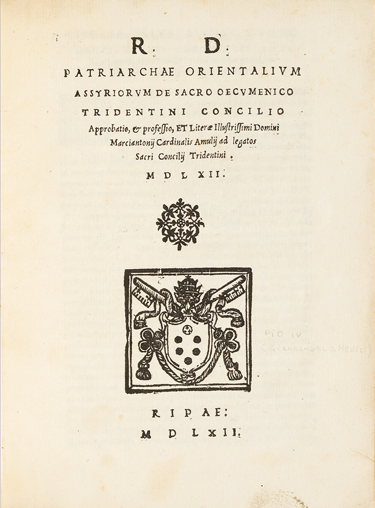 Abdisho - Marcantonio de Mula Patriarchae Orientalium Assyriorum de Sacro oecumenico Tridentini concilio approbatio Riva del Garda, Giacobbe Marcaria, 1562. In 4°. Stemma di Pio IV xilografato, legatura del XX secolo in mezza pergamena con titolo in oro al piatto. Rara prima edizione. Si tratta di una delle poche edizioni del primo tipografo di Riva di Trento, l'ebreo Jacob Marcaria. La produzione degli opuscoli conciliari costituisce, certamente, il dato più particolare a riguardo della produzione tipografica uscita dai torchi del Marcaria. L'opera contiene la professione di fede del Patriarca della Chiesa caldea, che era di confessione nestoriana, fatta davanti a papa Pio IV il 17 aprile 1562: è preceduta dalla lettera di presentazione al Concilio di Trento del Cardinale Marcantonio De Mula ed è seguita da un'altra lettera del Patriarca in cui sono elencate le diocesi orientali sotto il suo governo, che andavano dall'Impero Ottomano alla Persia e l'India. Ester, Editori e Tipografi di Trento e Rovereto, n. 10283.