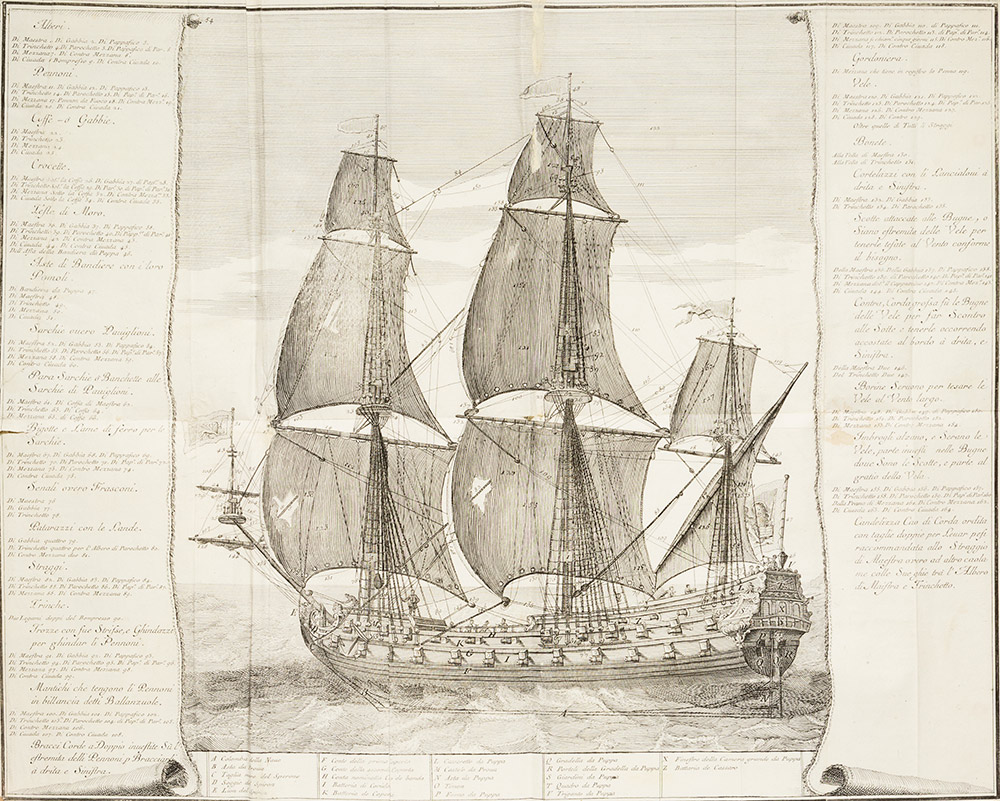 Alberti, Girolamo Introduzione all'arte nautica Venezia, appresso Giambatista Albrizzi, 1737. In 4°. Occhietto, 2 pregevoli antiporte calcografiche, vignetta al frontespizio, complessive 31 tavole incise in rame, di cui 24 ripiegate, capilettera e fregi xilografici, legatura coeva in pergamena, titoli in oro al dorso, tagli a spruzzo, custodia in cartone. Ex libris al contropiatto. Raro figurato veneziano del '700. Le due splendide antiporte con figure simboliche sono disegnate da Luca Carlevarijs e incise da Francesco Baronio; quattro tavole illustrano bandiere e blasoni, cinque recano volvelle mobili; molto interessante la grande tavola più volte ripiegata raffigurante un galeone veneziano, corredata da tre legende che indicano con precisione tutte le sue parti. L'Alberti tratta tutti gli aspetti della navigazione e della nautica, dall'astrologia agli strumenti scientifici per tracciare le rotte, ai venti, alla lettura di mappe e carte; l'opera è un trattato pratico rivolto ai comandanti e ai marinai veneziani. Riccardi I, 14.