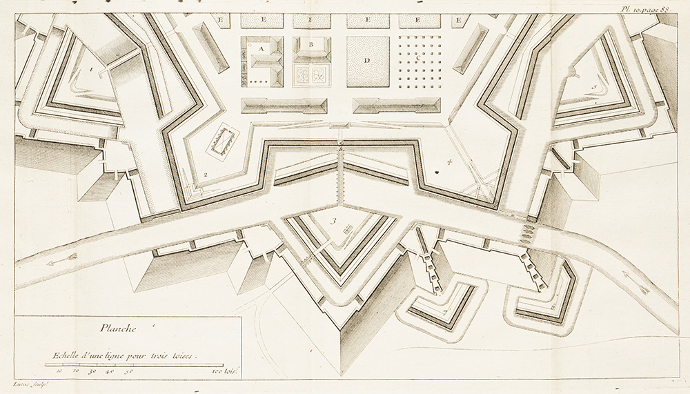 Architettura - Buchotte, Nicholas Les regles du dessein et du lavis, pour les plans particuliers des ouvrages et des batiments, et pour leur coupes, profils, elevation et facades, tant de l'architecture militaire que civile Parigi, Jombert, 1722. In 8° piccolo. Paris, Jombert, 1722. In 8° piccolo. Vignetta allegorica al frontespizio, con 14 tavole incise in rame ripiegate fuori testo, cancellatura fatta in antico al frontespizio, legatura coeva in vitello marrone, dorso a 5 nervi, tagli rossi. Prima edizione di questo testo, il cui autore si fregia del titolo di "ingénieur ordinaire du Roi", contenente le regole per il rilievo topografico e l'allestimento delle carte ad uso dell'architettura civile e militare; interessante la parte dedicata alla preparazione dei colori e ai metodi di coloritura delle mappe.