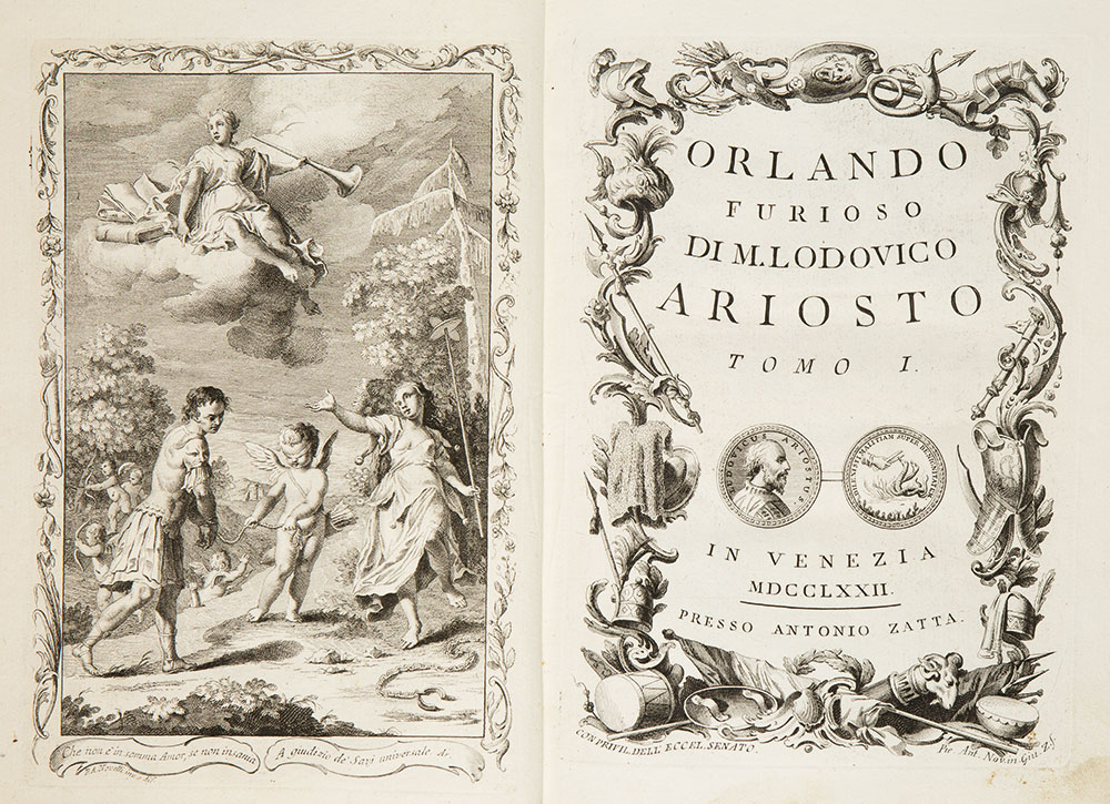 Ariosto, Ludovico Orlando furioso Venezia, Antonio Zatta, 1772-1773. In 4°. 4 Frontespizi e 58 tavole fuori testo in rame, legatura coeva in mezza pelle e cartone marmorizzato, fregi in oro e tassello di pelle verde con titolo in oro ai dorsi, tagli a spruzzo, numerose testatine, iniziali figurate e finalini in rame. Splendida edizione figurata del Furioso, capolavoro tipografico di Antonio Zatta. Opera illustrata con le tavole incise in rame da alcuni dei più importanti incisori veneti del settecento, Leonardis, Baratti, Zuliani e altri, su disegni originali del Novelli, che intaglia personalmente la splendida antiporta allegorica. Edizione assai stimata, con il testo corretto dai numerosi errori presenti nelle edizioni precedenti e con un vasto e utile apparato, indici dei nomi e delle località in fine al quarto volume. Morazzoni 232; Guidi 110; Gamba 61; Agnelli-Ravegnani I, pp. 202-203.