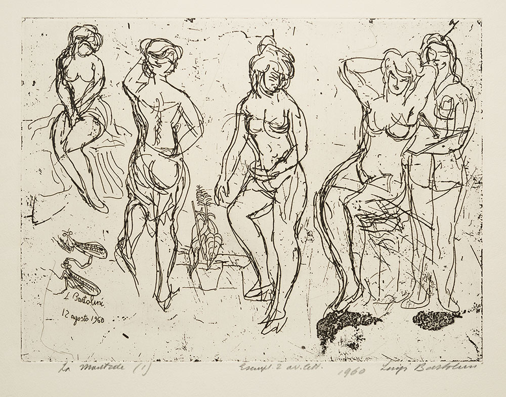 Bartolini, Luigi La mantide (1) Acquaforte, firmata e datata in lastra “L. Bartolini / 12 agosto 1960” (in basso a sinistra) ed a matita “Luigi Bartolini / 1960, con titolo a matita (in basso a destra), mm. 248 x 330 all’impronta della lastra. Esemplare n. 2 avanti lettera (a matita al centro del foglio).