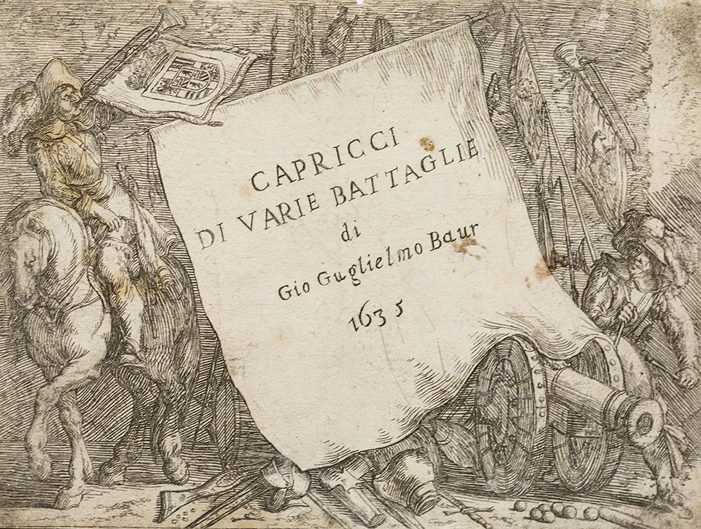 Baur, Johann Wilhem Capricci di varie battaglie s.l., s.e., 1635. In 8° oblungo. (107 x 140 mm). Fogli sciolti: frontespizio figurato, 9 (di 27) tavole incise all'acquaforte di cui tutte, tranne una, recanti titolo, difetti e piccole mancanze. Insieme di tavole che immortalano scene di battaglie spagnola, franzesa, fiamenga, turchescha, morescha, ecc. L'autore (c.ca 1600-c.ca 1640) soggiornò a lungo in Italia, rimanendo profondamente colpito e influenzato dal Callot e da Stefano della Bella.