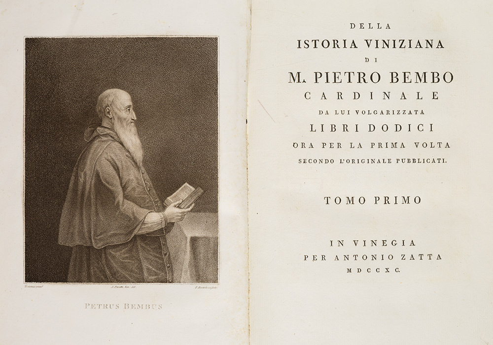 Bembo, Pietro Della istoria viniziana di m. Pietro Bembo Venezia, per Antonio Zatta, 1790. In 4°. 2 voll. Antiporta con ritratto inciso in seppia, legatura coeva in mezza pelle e cartone verde marmorizzata, titoli e fregi ai dorsi, angoli. Rara e ricercata edizione figurata. Curata da Jacopo Morelli, questa edizione è da tenersi in gran pregio in quanto esemplata sul codice originale autografo dello stesso Bembo ritrovato in quegli anni. Cicogna: "la storia del Bembo ha bellezza di lingua e di stile… Jacopo Morelli ci diede poi la stessa versione secondo l'originale... con erudita prefazione; cosicché pregevolissima è questa edizione per ogni conto". Il bel ritratto del Bembo in antiporta, disegnato da Pasetti da un dipinto di Tiziano, è inciso in rame da Francesco Bartolozzi. Cicogna 570; Gamba 131; Morazzoni p. 215.