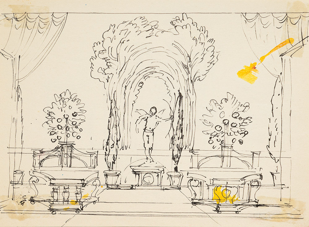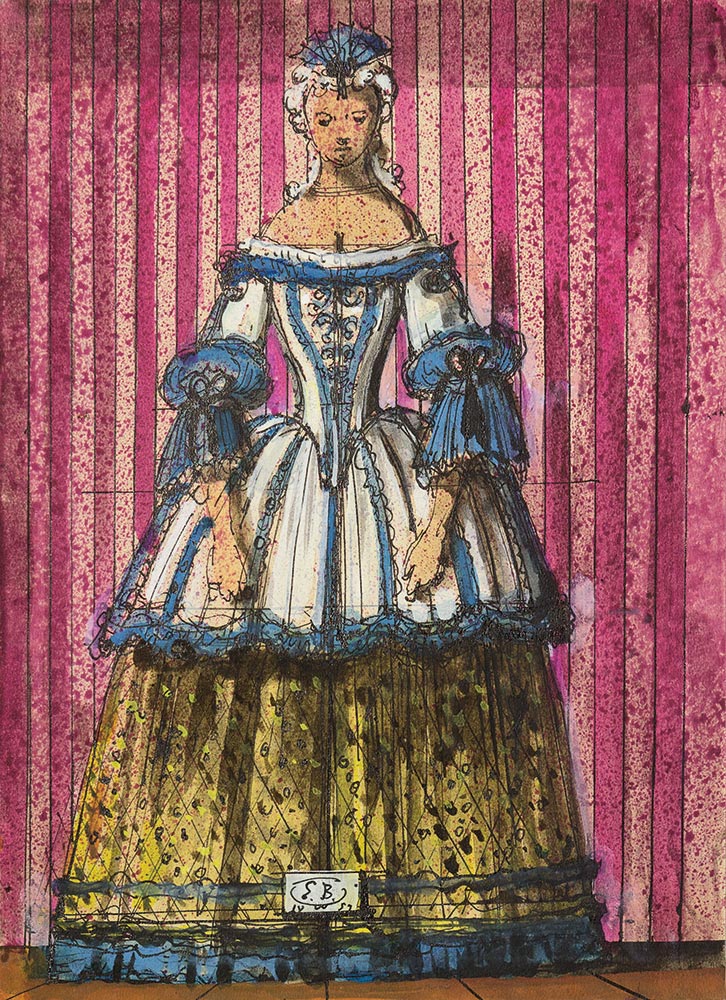 Berman, Eugene Così fan tutte Lotto composto da due bozzetti per costumi femminili, china e acquerelli colorati su carta, mm 240 x 173, firmati e datati; e da uno schizzo recto/verso per scenografia, china su carta, mm 165 x 209.
