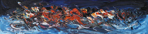 MARIO FALCHI Porto Maurizio 1950 Carica della cavalleria, 1995 olio su tela cm. 24x100, firma in basso al centro, titolo, firma, anno e archivio dell'artista numero D/22 al retro.