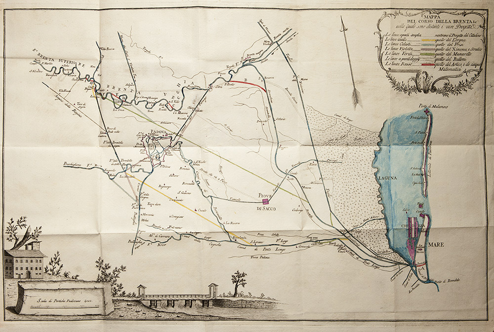 Brenta - Cristiani, Girolamo Francesco Della inalveazione, e del regolamento del fiume Brenta... Trattato critico-idraulico Milano, Luigi Veladini, 1795. In 4°. Antiporta incisa e una grande pianta del corso del Brenta, 480 x 690 mm., ripiegata più volte e colorata a mano ai confini, occhietto, legatura coeva in mezza pelle e cartone rustico spugnato, decorazioni in oro ai piatti. Nota di possesso al frontespizio di G.Fabris. La pianta raffigura il percorso del fiume dal Passo di S. Martino di Padova sino alla laguna: vi sono evidenziati a colori i progetti di Lorgna, Cittadino, Ximenes, Munaretto, Bellomi e Artico.