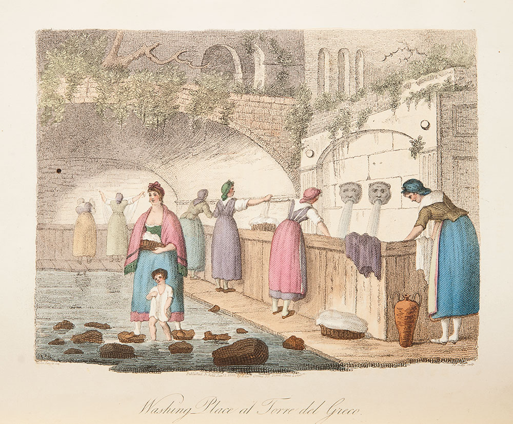 Buonaiuti, B. Serafino Italian Scenery Representing the Manners, Customs, and Amusements of the Different States of Italy Londra, T. M' Lean, 1823. In 2°. Con 32 tavole fuori testo incise su rame e colorate a mano da Godby su disegno originale di P.Van Lemberghi, ciascuna accompagnata da una o piu carte di testo in inglese e in francese, lievi macchie, legatura originale in marocchino bordeau a grana lunga, ai piatti cornice di filetti in oro e rotelle impresse a secco, al dorso titolo e fregi in oro, tagli dorati, porzione di dorso mancante, angoli sciupati. Seconda edizione (la prima è del 1806) di questo celebre libro sul costume ed il folclore italiano. Colas 2970; Lipperheide 258. Brunet II, 1639: "Ouvrage assez bien executé, tant dans les gravures que dans le texte".