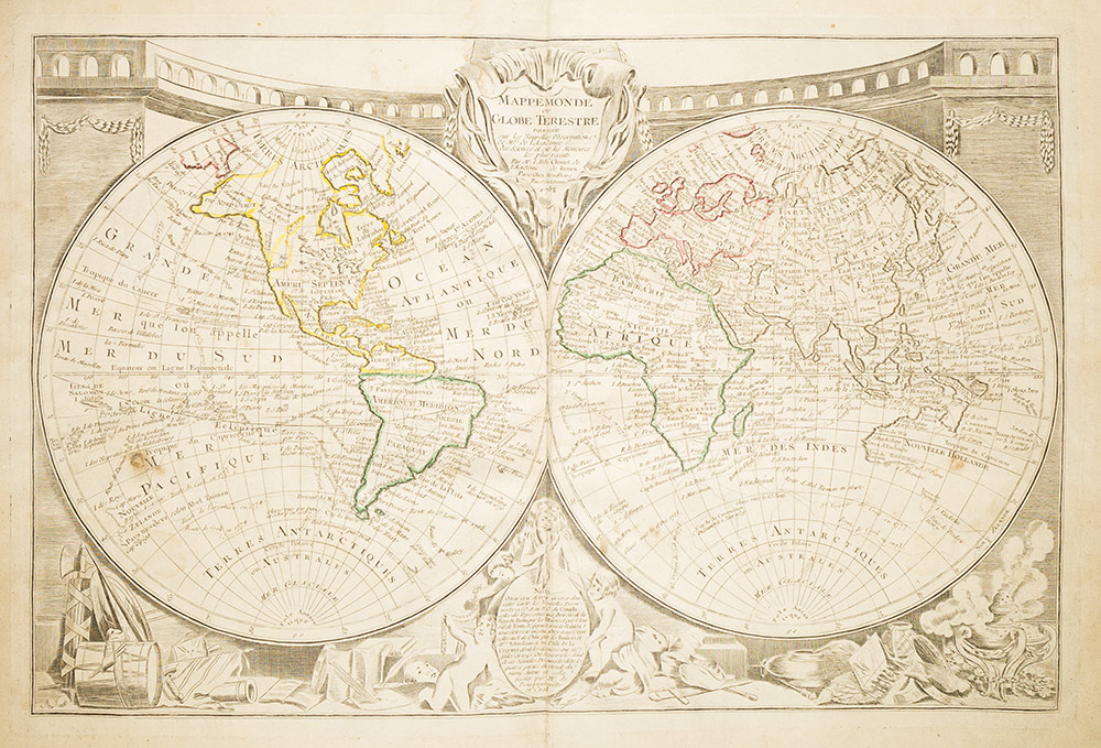 Cartografia Atlante composito Parigi, Mondhare,1757-1780. In 2°. 560 x 390 mm. Con 21 carte geografiche incise in rame, la maggior parte con coloritura coeva, a doppia pagina, difetti e mancanze, legatura coeva in cartonato e mezza pergamena, rovinata. Atlante francese composito che raccoglie rare carte generali e regionali di Clouet, Buache, La Fosse e Daumont, Jaillot, Bailleul, Julien, le Rouge and the Delisles, pubblicate per lo più da Mondhare a Parigi. Segnaliamo in particolare il Mappamondo di Clouet del 1787, il Theatre de la guerre présente Entre les Turcs, et les Russes stampato da Mondhare nel 1769, le isole britanniche di Mondhare del 1780, la Germania di de la Fosse del 1778, la Svizzera di Mondhare del 1777, l'Italia del De la Fosse del 1780, la Francia di Bailleul e la Spagna di Julien.