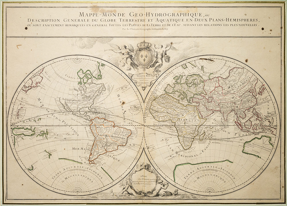 Cartografia - Sanson d'Abbeville, Nicholas - Jaillot, Hubert Mappe-Monde Geo-Hydrographique, ou Description Generale Parigi, Jaillot, 1719. Incisione su rame, mm. 465 x 660, di Louis Cordier in due emisferi, continenti con confini colorati, in alto il titolo, armi del dedicatario supportato da due angeli, al centro sotto gli emisferi cartiglio con i dati editoriali decorato con sirene e delfini, alcune macchie nel pannello del titolo, piegatura centrale, in cornice moderna in legno. Grande mappa del mondo dedicata al re di Francia in due emisferi in una proiezione stereografica.