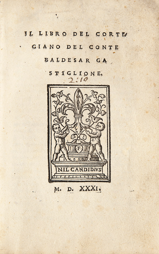 Castiglione, Baldassarre Il libro del cortegiano del conte Baldesar Gastiglione Firenze, per Benedetto Giunti, 1531. In 8°. Marca tipografica giuntina al frontespizio e in fine, nota di possesso alla carta A2 di Joanne Caligario, legatura coeva in pergamena floscia. Pregevole edizione giuntina del capolavoro di Castiglione, il testo fondativo della diplomazia moderna e un autentico best seller cinquecentesco con le sue quasi 100 edizioni in tutte le lingue conosciute nel solo sec.XVI.