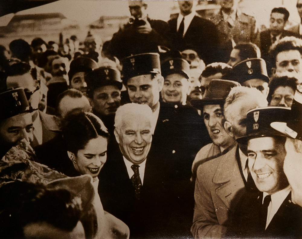 Chaplin, Charles Fotografia in bianco e nero, mm. 100 x 12, raffigurante Chaplin e la moglie Oona all’arrivo all’aereoporto di Orly a Parigi, attorniati da una folla di giornalisti e di amici, al verso il timbro dell’agenzia giornalistica romana “Vedo”. § Charles Chaplin. La mia autobiografia. Milano, Arnoldo Mondadori, 1964. In 8°. Copertina editoriale in tela rossa con titolo in oro lungo il dorso, sovracoperta illustrata al piatto anteriore, piccoli strappi.