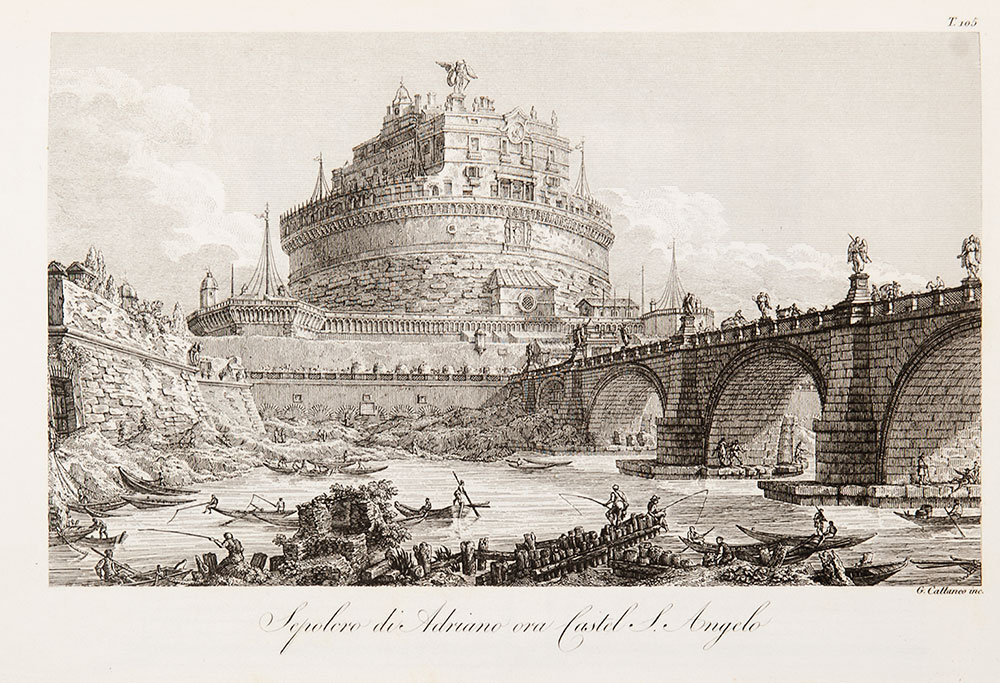 Moses, Henry Raccolta di vasi antichi, altari, patere, tripodi, candelabri, sarcofagi ecc. Milano, Società tipografica de' Classici italiani, 1824. In 4°. Frontespizio dentro cornice, 168 tavole suddivise in due serie, la prima con 150 tavole a piena pagina, la seconda con 18 tavole su 9 pagine, in fase di rilegatura del volume è stata alterata la successione delle tavole, rare e leggere fioriture, legatura coeva in mezza pelle con titoli e fregi in oro al dorso, tagli a spruzzo, imperfezioni ai piatti.