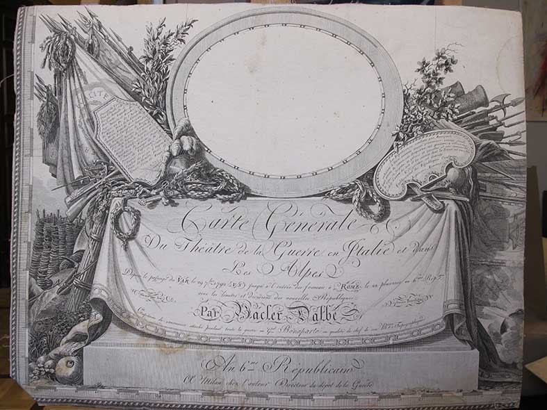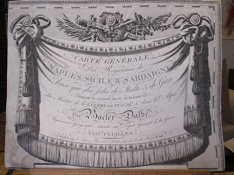 Napoleone - Cartografia - Bacler D'Albe, Louis Albert Ghislain Carte generale du theatre de la guerre en Italie et dans les Alpes. / Carte generale des royaumes de Naples, Sicile & Sardaigne... Parigi, l’Auteur, 1798-1802. Le due carte sono suddivise in sezioni e montate su tela, 30 fogli + 22 fogli (su 24, mancano due tavole della sezione meridionale), il tutto raccolto in una cartella in mezza tela e cartone, 650 x 515 mm., recante sul piatto il titolo “Carta topografica delle Guerre napoleoniche in Italia e Austria”, sciupata. Il cartiglio della sezione settentrionale si presenta senza testo, probabilmente si tratta di una tiratura avant-lettre. Prima edizione delle più esaustiva e completa mappa dell’Italia d’età napoleonica, realizzata in scala 1:256 000 dallo stratega militare e comandante Louis-Albert-Guislain Bacler D’Albe "who served Napoleon with hardly a break from 1796 to 1813,... he was probably the most indispensible of all Napoleon's aides. He was responsible for performing all the staff duties connected with Napoleon's planning sessions. Hew was entrusted with the task of amending maps and the maintenance of a large daily situation chart, on which every formation was marked by pins of different colours" (David Chandler, The Campaigns of Napoleon, p. 372). Bacler d’Albe si arruolò come volontario il 1 maggio 1793, e fu destinato all’armata delle Alpi. Fu fatto capitano il 20 marzo 1794. Balteau, and al.: Dictionnaire de biographie française, vol IV, p. 1103; Michaud, Biographie universelle ancienne et moderne, vol. 2, pp. 573-4.