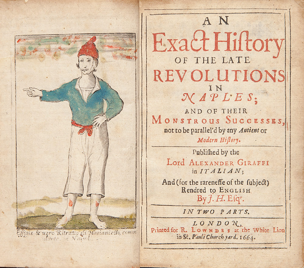 Napoli - Giraffi, Alexander An Exact History of the Late Revolutions in Naples Londra, Lowndes, 1664. In 8°. Frontespizio in rosso e nero, ritratto in antiporta di Masaniello colorata a mano. Legato con The second part of Massaniello. Londra, J.M., 1663. In antiporta ritratti in ovale di Masaniello, Gennaro e Genovino, bruniture, marginale restauro alla carta dei ritratti, legatura coeva in vitello spugnato, tagli a spruzzo rossi. La prima edizione uscì a Napoli nel 1647, questa è la prima edizione inglese. Rara.