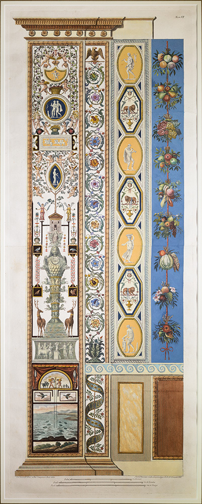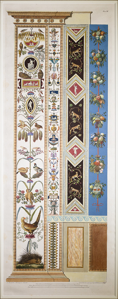 Ottaviani, Giovanni Logge di Raffaello Quattro acquaforti, numerate V, VI, VII e IX, Roma, 1772 - 1776, in coloritura a tempera moderna, incise dall'Ottaviani sui disegni del Savorelli e del Camporesi, ciascuna c.ca mm. 1100 x 410 all'impronta della lastra e mm. 1310 x 610 il foglio, montate su passepartout bianchi. Quattro tavole dalla serie completa di 12 incisioni realizzate da Giovanni Ottaviani che raffigurano le logge vaticane affrescate da Raffaello.