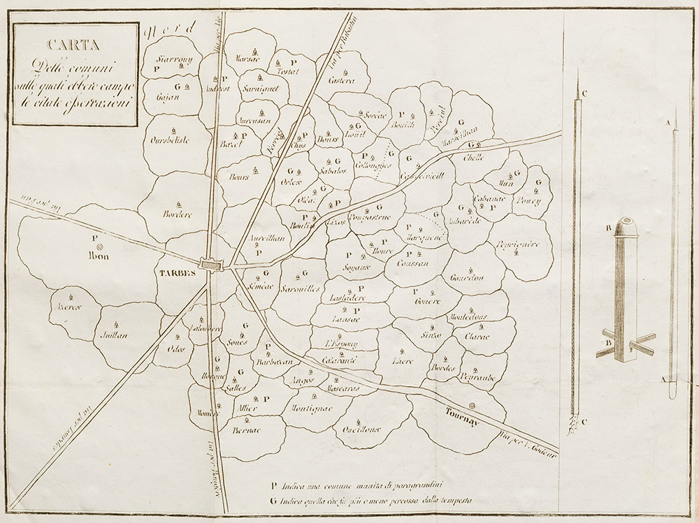 Parafulmini - Beltrami, Paolo Nuova scoperta importantissima comprovata dai più felici esperimenti per preservare le campagne dalla grandine devastatrice ed inaffiarle invece con pioggia riparatrice presentata per la prima volta all'Italia... fornita della Carta Geografica delle Comuni Milano, Brambilla, 1823. In 8°. 1 carta topografica del territorio di Tarbes incisa su rame ripiegata f.t., brossura editoriale a stampa. Esposizione del sistema adottato nelle Comuni del territorio di Tarbes per preservare le campagne con l'installazione di un sistema di paragrandini e parafulmini su pertiche e piantoni distribuiti nei pressi delle coltivazioni più esposte. La pianta topografica presenta i Comuni in cui ebbero luogo le osservazioni, e illustra anche parafulmini e piantoni. Rossetti & Cantoni, p. 17.