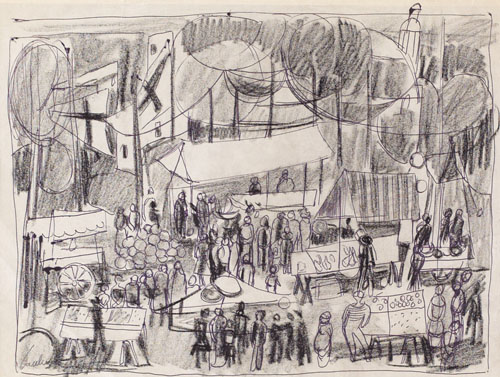 ENRICO PAULUCCI Genova 03/10/1901 - Torino 22/08/1999 Mercato ligure, (1960) tecnica mista su carta cm. 24x34, firma in basso a sinistra, opera registrata presso l'Archivio delle Opere di Enrico Paulucci come da dichiarazione del Maggio 2011 su foto