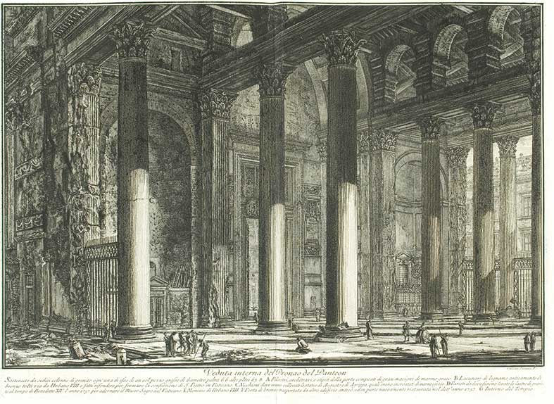 Piranesi, Giovanni Battista Veduta interna del Pronao del Panteon Acquaforte, 1769, I stato di III, piegatura centrale, mm. 385 x 533 all’impronta della lastra e mm. 558 x 620 il foglio. Hind 82.