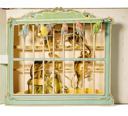 Pop-up book - Weedon, L. L. & Hetcher, Evelyn The Model Menagerie with natural history stories Londra & New York, Ernest Nister - E. P. Dutton, n.d. 1895. In 4° oblungo, 273 x 355 mm., elegante copertina editoriale illustrata, 6 pop-up panels dove animali differenti nelle gabbie escono fuori dalla pagina ad apertura di foglio, ogni immagine è accompagnata da una breve storia naturale delle specie mostrate, diverse altre illustrazioni nel testo, appena lento alle cerniere il piatto superiore. Ex libris al contropiatto di John Lawson. Uno dei classici libri per bambini di Nister, stampato come di consueto in Bavaria, in perfette condizioni di conservazione. Ernest Nister (1842-1909) fu l’editore più celebre di pop-up books della fine del XIX sec, tedesco di nascita allargò enormemente il pubblico di questo genere di libri.Riuscì a combinare belle e facili illustrazioni con un procedimento litografico che consentisse di creare un nuovo genere di pop-up. Rispetto ai modelli precedenti, Nister ideò un sistema atto a far uscire la scena dal libro al semplice sfogliare delle pagine. Sino ad allora le immagini tridimensionali andavano ricreate a mano agendo su alcuni tiranti, nei libri di Nister invece automaticamente erompevano dalla pagina senza che il lettore facesse nulla. In questo modo le scene dei libri di Nister potevano avere sino a 4 livelli di rappresentazione delle immagini; venivano realizzati adottando un procedimento tecnicamente molto sofisticato per i tempi, con diversi livelli di creazione delle immagini, montaggio e assemblaggio delle parti.